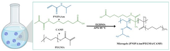 The microgels (MP) were prepared using the procedure of dispersion polymerization as follows: 0.35 g of NIPAAm, 0.15 g of PEGMA, CAM5 (5, 10 or 15% mol), and 5% mol of crosslinker EGDMA (Figure 7) were acquired, and then dissolved in 50 milliliters of distilled water in a single-necked flask, stirring for 30 min. The oxygen was removed via Nitrogen purging. Then, the mixture was heated to 85 °C to initiate the reaction, and 2% mol of APS as initiator was added to the solution and stirred for 45 min. The flask was placed in a water/ice bath to stop the polymerization process []. The solution containing MP was purified by dialysis tubing (12–14 kDa) for 7 days. The microgels were recovered by freeze-drying.