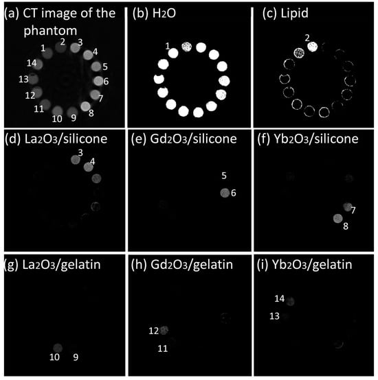 (a) Reconstructed transversal slice of calibration phantom where 1 is H2O, 2 is lipid, 3 and 4 are La2O3/silicone with 10 and 40 mg·mL−1, 5 and 6 are Gd2O3/silicone with 10 and 40 mg·mL−1, 7 and 8 are Yb2O3/silicone with 10 and 40 mg·mL−1, 9 and 10 are La2O3/gelatin with 10 and 40 mg·mL−1, 11 and 12 are Gd2O3/gelatin with 10 and 40 mg·mL−1, and 13 and 14 are Yb2O3/gelatin with 10 and 40 mg·mL−1. (b–i) Results of application of material determination criteria for determination of H2O (b), lipid (c), La2O3/silicone (d), Gd2O3/silicone (e), Yb2O3/silicone (f), La2O3/gelatin (g), Gd2O3/gelatin (h), and Yb2O3/gelatin (i).