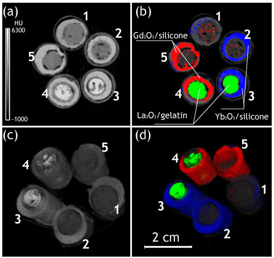Survey scans, including transversal slices (a,b) and 3D reconstructions (c,d) of the gelatin-filled implants in energy-integrative mode (energy window 37–48 keV, (a,c)) and material determination mode (b,d). Gd—red; La—Green; Yb—yellow; 1—gelatin@silicone; 2—gelatin@(Yb2O3/silicon); 3—(La2O3/gelatin)@(Yb2O3/silicon); 4—(La2O3/gelatin)@(Gd2O3/silicon); 5—gelatin@(Gd2O3/silicon).
