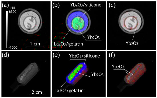 The energy-integrative (a,d) and material determination (b,c,e,f) reconstructions ((a–c)—transversal slices; (d–f)—3D visualizations) of the La2O3 + gelatin/Yb2O3 + silicone implant. Yb2O3 absorbed at the interface is shown in red.