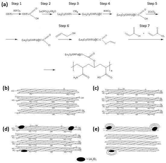 The general scheme of the synthetic route (a). The models of GNFs (b), GNFs_ox (c), Ln2O3/GNFs (d), and (Ln2O3/GNFs)@C (e).