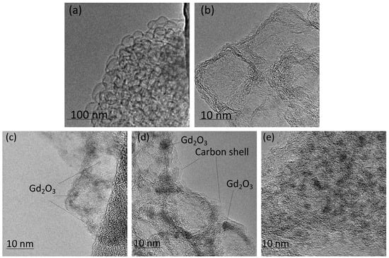 TEM images of GNFs (a,b), Gd2O3/GNFs (c), (Gd2O3/GNFs)@C (d), and (Gd2O3/GNFs)@C_ox (e).
