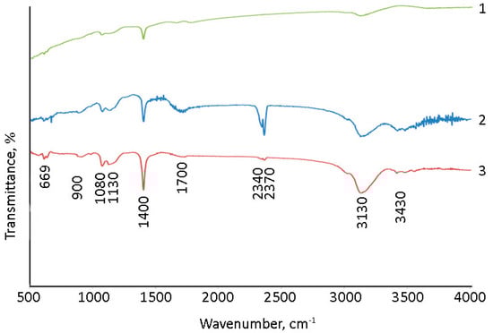 IR spectra of 1—GNFs_ox; 2—(Gd2O3/GNFs)@C_ox; and 3—(Gd2O3/GNFs)@C-COOCH2C2H3.
