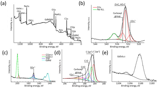 The chemical composition and the nature of atoms in the (Gd2O3/GNFs)@C-COOCH2C2H3 composition were confirmed by XPS (Figure 7). The sample consisted of 57.4 at.% C, 16.1 at.% O, 3.5 at.% Gd, 7.4 at.% Na, 9.8 at.% Cl, 3.9 at.% N, and 1.8 at.% S (Figure 7a). The sample contained NaCl (Figure 7b,c) and Na2SO4 (Figure 7c) as by-products of a metathesis reaction between (Gd2O3/GNFs)@C-COCl and NaOCH2C2H3 according to step 6 and the formation of acyl chloride via step 5 (Figure 4). Nitrogen atoms were predominantly found in the form of oxides (Figure S3, Supplementary Materials) and remained in the product after the surface oxidation phase [57,59]. High-resolution deconvoluted C1s XPS spectra of (Gd2O3/GNFs)@C-COOCH2C2H3 (Figure 7d) contained different carbon species with binding energies of 284.4, 285.2, 286.4, 287.6, 288.8, and 290.3 eV corresponding to sp2- and sp3-hybridized C, C–O, ketone C=O, and hydroxyl C(O)O groups and CO32−. This confirmed the presence of all possible carbon groups expected in (Gd2O3/GNFs)@C-COOCH2C2H3. The CO32− group in the spectra was presumably related to Gd carbonate (Figure 7e) [67] which was formed as the primary Gd phase [23]. This assumption is supported by O1s XPS spectra showing binding energies of 531.2, 532.9, and 534.0 eV corresponding to CO32−, C=O/C-OH, and COO- groups (Figure 7b).