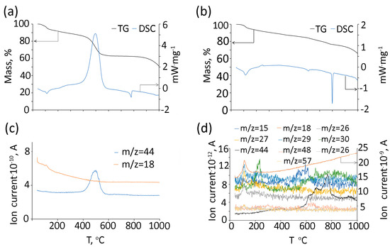 TG/DSC data of (Gd2O3/GNFs)@C-COOCH2C2H3 with mass-spectra of evolved gasses for the measurements in the air and Ar atmosphere are depicted in Figure 8a,c and Figure 8b,d, respectively. During heating in an oxidizing atmosphere, adsorption water is released with heat absorption (Figure 8a,c). Then, the carbon shell burns with an intense release of heat and CO2 peaking at approximately 500 °C. This is followed by an endothermic peak caused by the melting of NaCl, a by-product of the synthesis process. At temperatures above 800 °C, the salt decomposes, releasing chlorine. The residual mass of 50% corresponds to Gd2O3. In an inert atmosphere, the composition of gaseous products is more complex (Figure 8b,d). Water (m/z = 18, 17, and 16) and carbon dioxide (m/z = 44, 12, and 45) are released in a wide temperature range. The peak of water release is observed at a temperature slightly above 110 °C. There are also peaks for m/z = 29 (C2H5+), 27 (C2H3+), and 26 (C2H2+). Amidst background noise, peaks are also observed for m/z = 57(C3H5O+) and 56 (C3H4O+). Above 130 °C, the m/z = 30 peak begins to appear, reaching its maximum at around 230 °C. At approximately 590 °C, the maximum ion current for m/z = 15 (CH3+) is observed. Between 600 and 700 °C, SO2 is released (m/z = 64, 48) due to the by-product of synthesis in accordance with XPS data. The maximum CO2 emission is observed near 770 °C, but it is released over a much broader temperature range compared to an oxidizing atmosphere (Figure 8d).