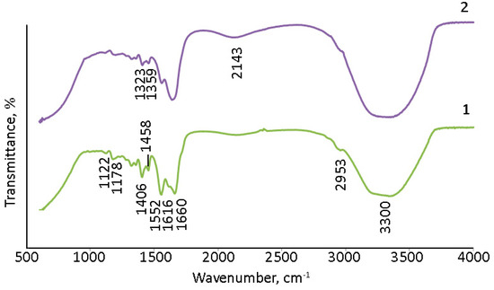 The materials were studied using an FTIR spectrometer, FSM 1202 (Infraspek, Moscow, Russia). Transmission spectra were obtained by accumulating 30 scans with a resolution of 4 cm−1. Powdered samples were pressed into tablets with KBr (98.5%, BLD Pharmatech Ltd. China, Shanghai, China) using a hydraulic press (OMEC, Brescia, Italy). A reference spectrum was registered from a pure KBr pellet. Polyacrylamide samples were pressed to a ZnSe crystal of the multi-reflection ATR accessory.