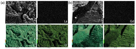 The uniformity of Ln2O3 distribution in the PAM matrix was confirmed by scanning electron microscopy (SEM) images and surface element mapping (Figure 10). The contents of La and Gd were 0.61 and 0.30 wt.% according to EDX data, which are in good agreement with the synthesis process.