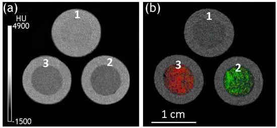 Transversal slices of the reconstructed PAM-filled implants in energy-integrative (a) and material determination (b) modes: 1—PAM/silicone; 2—(La2O3/GNFs)@C-COOCH2C2H3/PAM/silicone; and 3—(Gd2O3/GNFs)@C-COOCH2C2H3/PAM/silicone. Green—La; red—Gd.