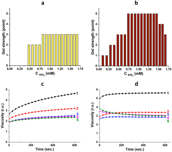 Concentration diagrams and viscosity dependence over time for CSS/IO3−-based gels before (a,c) and after (b,d) visible-light exposure for 1 h. Numbers 1, 2, 3, 4, and 5 on graphs (c,d) correspond to samples 8, 10, 12, 14, and 16 (see Table, Figure 1B).