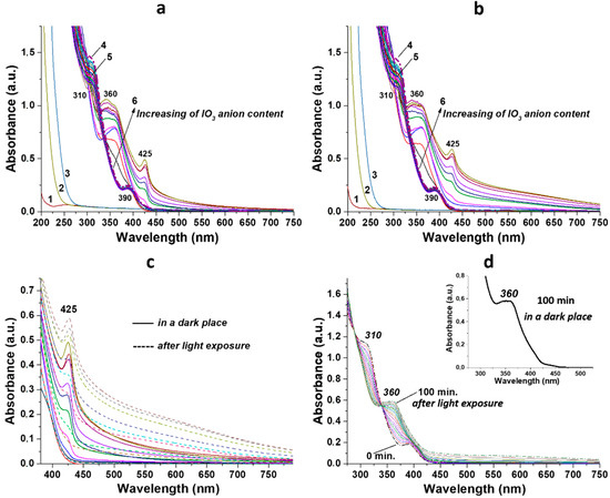 The UV analysis revealed significant changes in the absorption spectra of gels based on iodate ions compared to the spectrum of the initial CSS (Figure 4). The position of the main absorption bands of CSS and their intensity at 310 and 390 nm remained constant after visible-light exposure of the hydrosol (Figure 4a,b, graph 4). There were no changes in the spectra of the initial electrolyte solutions (Figure 4,a,b, graphs 1, 2, 3) as well as the CSS/ClO3− and CSS/BrO3− systems (Figure 4,a,b graphs 5). The addition of IO3− anions to the CSS resulted in the appearance of new absorption peaks at 350–360 and 425 nm after 24 h of samples being kept in a dark place (Figure 4a). The higher the concentration of the iodate ion, the stronger the absorption of these bands. The absorbance and position of these bands did not change after one week of samples being kept in the dark. After the irradiation of CSS/IO3− systems, the position of these two peaks remained unchanged, but the absorption at 425 nm increased, especially noticeable in the visible wavelength range from 450 to 750 nm (Figure 4c). The kinetics of the observed phenomenon showed that, regardless of whether the samples were in the dark or in the light, the same accumulation of the product occurred at 350–360 nm after an equal period of time (Figure 4d). The difference was in the higher absorption in the spectral range from 450 to 750 nm of the irradiated system compared to the one in a dark. Thus, the reaction between iodate anions and CSS was initiated in the absence of light, then paused at some point and further continued only under visible-light exposure.
