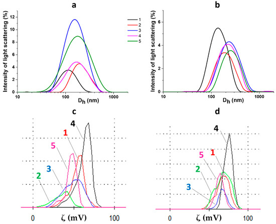 Particle size and zeta potential distributions for CSS/IO3− systems before (a,c) and after (b,d) visible-light exposure for 1 h. 1, 2, 3, 4, and 5 correspond to systems 8, 10, 12, 14, and 16 (see Table, Figure 1B), respectively.