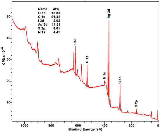 XPS analysis, a powerful technique for investigating the composition and chemical state of surface components in various compounds, was performed to clarify the observed phenomena (Figure 6 and Figure 7). As shown in Figure 6 the synthesized gels (in the form of xerogels) contain oxygen, carbon, iodine, silver, sulfur, and nitrogen on their surface and in near-surface atomic grids in appropriate concentrations.