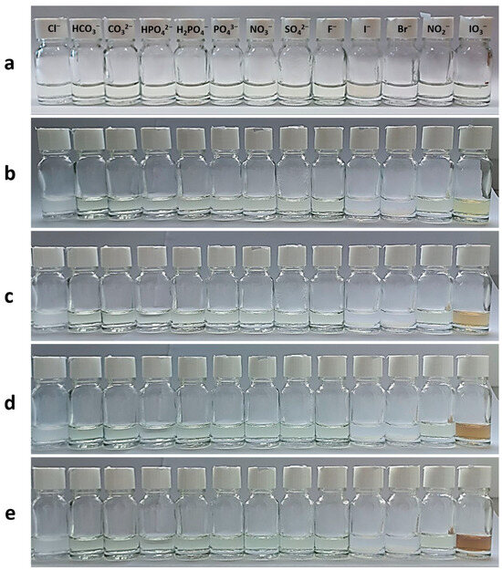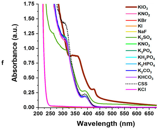 Due to the CSS being more sensitive to the IO3− anion compared to ClO3− and BrO3− anions, we decided to test the effect of other anions. We selected anions commonly consumed by humans through food and water (Figure 8). These included oxidizing, reducing, and inert agents. Upon immediate mixing of hydrosol with the corresponding electrolyte, no visible changes in the colloidal stability of the system or its color were observed (Figure 8a). After one day in a dark environment, systems with halogens, except for fluoride ion, began to opalesce (Figure 8b), as previously observed in our recent study [9]. A slight color change was noticeable in the system with iodate anion. Further exposure to visible light for an hour resulted in gradual color intensification only in the iodate anion-based sample (Figure 8c–e). UV spectroscopy data revealed a distinctive characteristic spectrum only in the iodate anion-based system (Figure 8f).
