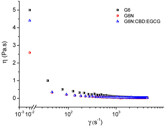 Viscosity as a function of the shear rate of G6, G6N, and G6N:CBD:EGCG formulations at 25 °C.