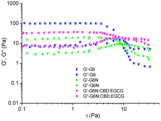 Variation in elastic (G′) and loss (G″) moduli as a function of shear stress (τ) of G6, G6N, and G6N:CBD:EGCG formulations. All measurements were carried out at 35 °C.