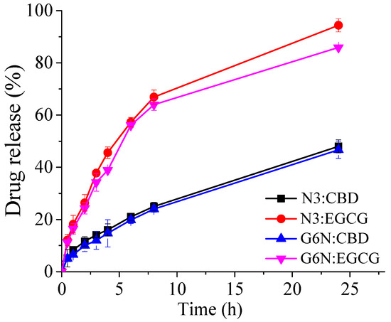 As evident from the presented data, drug release from niosomes is a two-phase process, comprising an initial higher release rate (i.e., burst effect) and a subsequent sustained release. The observed in vitro profile is characteristic of these types of nanocarriers; however, it is noteworthy to mention that the process is greatly affected by the physicochemical properties of the loaded phytochemicals. In this regard, the hydrophilic EGCG is characterized by a higher release rate compared to the hydrophobic CBD. A slight reduction in drug release was observed upon the inclusion of niosomes into the in situ gelling system, which may be attributed to the barrier function of the three-dimensional polymer network, restricting the diffusion of the entrapped compounds. A similar tendency was estimated in other relevant studies [28,29], irrespective of the type of incorporated nanocarrriers, e.g., nanoparticles or vesicular systems. In their study, Abbas et al. prepared oxytetracycline-loaded nanoparticles included in thermosensitive (Poloxamer 407-based) in situ gel. The observed lower drug release from the in situ gelling systems may be explained by the crosslink formation in the Poloxamer matrix and the resulting obstruction thereof, which further emphasizes the role of the drug delivery platform in the release process [28].