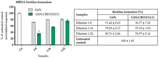 The quantitative evaluation of the biofilm inhibition reveals approximately 60% inhibition of the MRSA adhesion compared to the untreated control (Figure 6). The effect is concentration-dependent and decreases with increased dilution. The results show (Supplementary Materials, Tables S1 and S2) that the plain niosomal gel slightly inhibits the biofilm formation, but there is no significant difference between the three dilutions of the gel (G6N). On the contrary, there is a significant difference (p < 0.002) between the dilutions of drug-loaded G6N:CBD:EGCG formulation, the untreated control, and the dilutions, showing the concentration-dependent biofilm inhibitory effect of the combination. A dilution of G6N:CBD:EGCG inhibits the MRSA biofilm formation with approximately 60%, dilution 1:16 with around 42%, and dilution 1:32 with ca. 20% (which is the same as that of G6N).