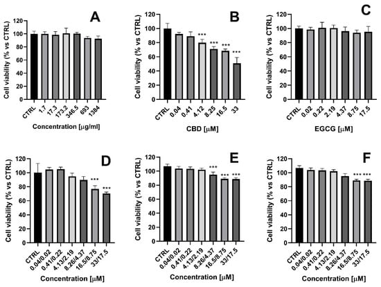Cytotoxicity on HaCaT cells of: (A) empty niosomes (N6); (B) free cannabidiol (CBD); (C) free epigallocatechin (EGCG); (D) combination of free cannabidiol and free epigallocatechin (CBD + EGCG); (E) dual-loaded CBD and EGCG vesicles (N:CBD:GCG, formulation) niosomes and (F) niosomal in situ gel based on double-loaded niosomes (G6N:CBD:EGCG), measured by MTT assay. All groups were compared statistically vs. untreated controls by one-way ANOVA with Dunnet’s post hoc test. The results are expressed as means ± SD of triplicate assays (n = 8). *** p < 0.001 vs. control (CTRL, untreated control cells).