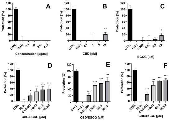Protective effects of (A) empty niosomes; (B) free CBD; (C) free EGCG; (D) combination of free CBD and free EGCG (CBD + EGCG); (E) dual-loaded CBD and EGCG (N:CBD:EGCG) niosomes and (F) niosomal in situ gel based on double-loaded niosomes (G6N:CBD:EGCG) in a H2O2-induced damage model in human keratinocyte HaCaT cell line. The results are expressed as means ± SD of triplicate assays (n = 8). ANOVA with Dunnett’s post-test. * p < 0.05; ** p < 0.01; *** p < 0.001 vs. H2O2 CTRL (untreated control cells); H2O2 cells treated with H2O2 (200 µM).