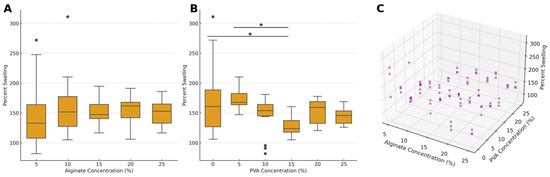 Percent swelling behavior of hydrogel samples in response to varying concentrations of alginate and PVA. (A) Box-and-whisker plots showing percent swelling across different alginate concentrations. The boxes represent the interquartile range (IQR), the lines indicate the median, whiskers extend to the data range, and individual data points displayed as circles are outliers. (B) Box-and-whisker plots showing percent swelling across different PVA concentrations, with statistical significance indicated between specific pairs of PVA concentrations. (C) Three-dimensional scatter plot illustrating the combined effect of alginate and PVA concentrations on percent swelling, providing an integrated view of their joint impact on swelling behavior. Asterisks denote statistical significance: * p < 0.05.