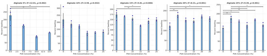 Given the overall significance of PVA concentration on the 48-h swelling of the hydrogels, we further analyzed its effect within each fixed alginate concentration (Figure 3). When using 5% alginate, increasing the PVA concentration generally led to a reduction in swelling, with mean swelling decreasing from 226.7% at 0% PVA to 115.1% at 15% PVA, with the ANOVA results indicating a significant effect of PVA concentration on percent swelling (p = 0.002). This trend was observed across all but 10% alginate, with significant effects of PVA concentration on swelling found at 15% alginate (p = 0.006), 20% alginate (p = 0.001), and 25% alginate (p < 0.001).