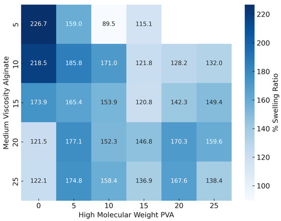 Heatmap displaying the 48-h percent swelling ratio of hydrogel samples across varying concentrations of high-molecular-weight PVA and medium-viscosity alginate. The color intensity corresponds to the swelling ratio, with darker blue shades representing higher swelling percentages. Each cell is annotated with the mean swelling ratio (%) for the corresponding combination of PVA and alginate concentrations. This visualization highlights the inverse relationship between PVA concentration and swelling, as higher PVA levels generally correspond to lower swelling ratios, particularly at lower alginate concentrations.