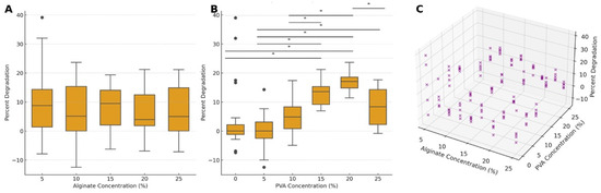 Percent degradation of constructs after 28 days in culture in response to varying concentrations of alginate and PVA. Box-and-whisker plots show percent degradation across alginate concentrations (A) and PVA concentrations (B), with boxes representing the interquartile range (IQR), and the lines indicating the median. Whiskers extend to the data range, and individual data points displayed as circles are outliers. A 3D scatter plot (C) illustrates the combined effects of alginate and PVA concentrations on percent degradation, offering an integrated view of their joint impact on material degradation. Asterisks denote statistical significance: * p < 0.05.