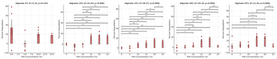 Given the significant effect of PVA concentration on the degradation of the hydrogels, we chose to further explore the relationship between PVA concentration and degradation within fixed alginate concentrations (Figure 6). At 5% alginate, there was no statistically significant effect of PVA on degradation; however, for alginate concentrations of 10% and higher, PVA significantly affected degradation. At 10%, 15%, 20%, and 25% alginate concentrations, increases in PVA concentration contributed to significant degradation increases (all p < 0.0001). These findings indicate that, except at the lowest alginate concentration (5%), increasing PVA concentration contributes to a statistically significant increase in degradation across all other alginate levels.