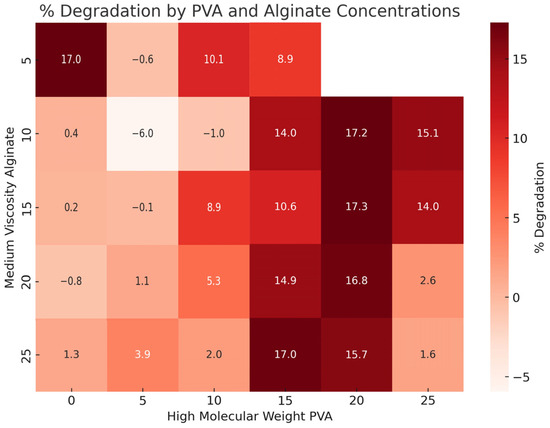 The heatmap in Figure 7 provides a comprehensive view of the degradation behavior across varying PVA concentrations in alginate-based hydrogels. This trend highlights the inverse relationship between PVA concentration and matrix stability, where increased PVA may disrupt the polymer network, accelerating degradation over time. The data suggest that while higher PVA levels tend to increase degradation, the rate varies depending on the specific balance between PVA and alginate concentrations.