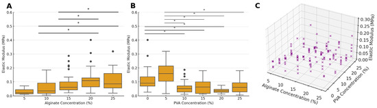 Elastic modulus behavior of hydrogel samples in response to varying alginate and PVA concentrations. (A) Box-and-whisker plots of modulus values across alginate concentrations, with boxes representing the interquartile range (IQR), the lines indicating the median, and whiskers extending to the data range, with outliers represented as individual data points. (B) Box-and-whisker plots of modulus values across different PVA concentrations, with significant differences between specific PVA concentrations. (C) Three-dimensional scatter plot illustrating the combined effect of alginate and PVA concentrations on modulus, offering an integrated view of their joint impact on mechanical properties. Asterisks denote statistical significance: * p < 0.05.