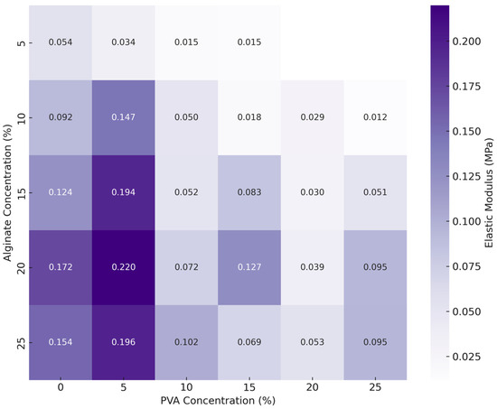 Heatmap of elastic modulus by PVA and alginate concentrations. This heatmap illustrates the elastic modulus (MPa) of constructs at varying concentrations of PVA and alginate, as determined by compression testing. Each cell represents the mean elastic modulus for a specific combination of PVA and alginate concentrations, with values shown to three decimal places. Darker shades of purple indicate higher elastic modulus values, signifying stronger constructs.