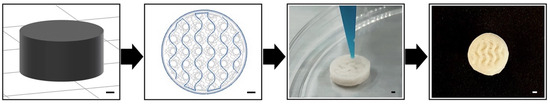 Schematic representation of the bioprinting process for alginate–PVA hydrogel constructs. From left to right: (1) Three-dimensional model of the cylindrical construct designed for bioprinting; (2) slicing of the 3D model to create a 50% gyroid infill pattern; (3) extrusion of the hydrogel bioink in the specified design; (4) final printed hydrogel construct after crosslinking. Scale bar represents 1 mm.