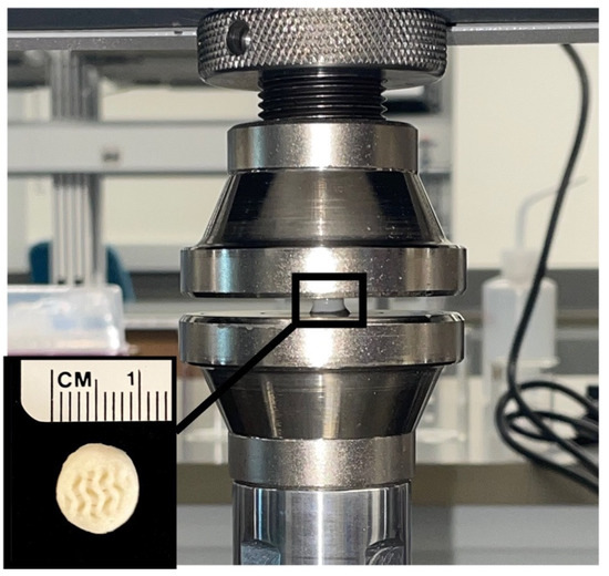 Uniaxial unconfined compression testing setup. A cylindrical 3D bioprinted hydrogel sample is positioned between stainless-steel compression platens in the mechanical testing machine. The close-up inset shows the hydrogel sample’s gyroid infill structure with a scale for size reference. True measurements of the hydrogels were performed using digital calipers prior to compression testing.