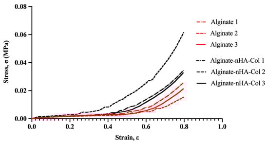 | Parameter (MPa) | Alginate | Alginate-nHA-Col (w/v) | p Value |