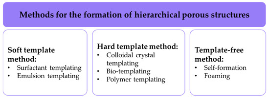 Numerous methods for forming hierarchical porous structures are described in the scientific and technical literature; they can be broadly divided into three categories [4]: soft template methods, hard template methods, and template-free methods (Figure 1).