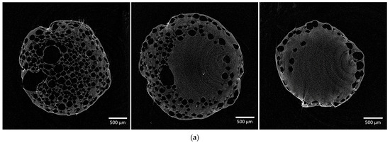 Figure 4 presents the micro-CT results for aerogel particles obtained using surfactant. Two-dimensional cross-sections in three planes reveal a well-developed macroporous structure in the outer shell of the particles, while the inner portion consists of a mesoporous structure. This material configuration arises from gas bubble formation at the interface where the polymer solution contacts the crosslinking agent solution on the droplet’s surface.