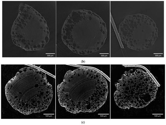 Micro-CT two-dimensional cross-sections in three planes of samples obtained using (a) 0.25 wt.% surfactant; (b) 0.50 wt.% surfactant; (c) 1.00 wt.% surfactant.