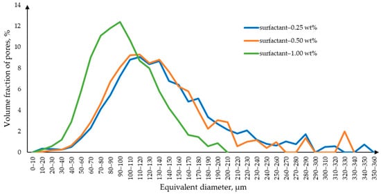Micro-CT data processing yielded pore size distribution curves (Figure 5), which show that with an increase in the surfactant concentration, the size of the macropores decreases. This is due to the fact that with an increase in the surfactant concentration, the stability of the foam increases, which helps to avoid bubble coalescence.