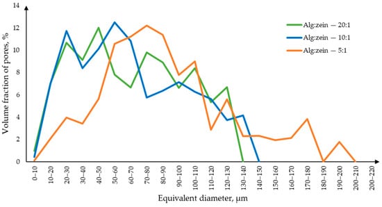 The macropore size distribution curve (Figure 7) shows that samples with an alginate–zein ratio of 5:1 are characterized by larger macropores. This suggests that an increase in zein content leads to its agglomeration and, accordingly, to the formation of larger macropores.
