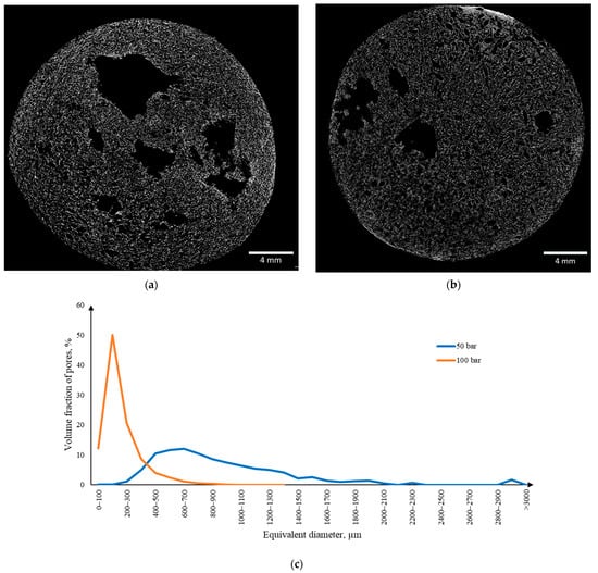 Micro-CT results of the sample obtained using the template-free method by foaming in a carbon dioxide medium: (a) two-dimensional cross-sections obtained at 50 bar pressure for 3 h; (b) two-dimensional cross-sections obtained at 100 bar pressure for 3 h; (c) differential macropore size distribution curve.