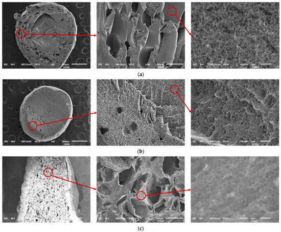 SEM images of the samples obtained by different methods: (a) using surfactants at a concentration of 0.5 wt.%; (b) using zein with a sodium alginate–zein ratio of 5:1; (c) using the template-free method by foaming in a carbon dioxide medium (calcium carbonate concentration 2 wt.%, pressure 100 bar, duration 3 h). The circle shows the increase in zoom.