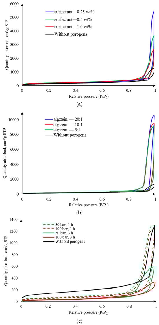 Nitrogen adsorption–desorption isotherms at 77 K for the samples obtained by different methods: (a) using surfactant; (b) using zein; (c) using template-free method by foaming in a carbon dioxide medium.