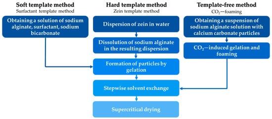 Hard templates, such as colloidal crystals, proteins, or polymers, can also be used. For example, in Ref. [18] the authors investigated the production of hollow spherical silicon particles using polystyrene as a template. Silica gel was applied to 200–250 nm polystyrene particles using tetraethoxysilane as a precursor and cetyltrimethylammonium bromide as a crosslinking agent. The template was removed by calcination at 550 °C. At various production parameters, the hollow particles had dimensions of 170–230 nm with a pore size of 2.2–50 nm. Another example involves using the biocompatible protein zein as a template. In Refs. [19,20] the process of obtaining starch-based aerogels using zein as a template for macropore formation was studied. The removal of the zein from the structure was achieved by dissolving it in ethyl alcohol. The results demonstrated that incorporating zein into the aerogel production process facilitated the formation of macropores (approximately 2 microns), even in compositions with a low zein content. Additionally, supercritical drying effectively preserved the material’s mesoporous structure.