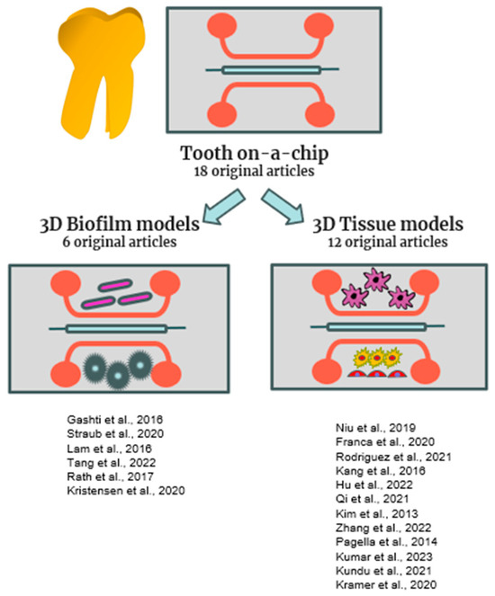 Most of the studies for novel materials and techniques were primarily tested in in vitro 2D models. However, to test intelligent bioactive materials and drug carriers, there is a need for experimental models able to recapitulate the unique architecture of the non-mineralized tissue (dental pulp) and of the three mineralized tissues (enamel, cementum, dentin). Consequently, before the introduction of tooth-on-a-chip, the only alternative was represented by the animal model. In our review, 18 original articles were selected for the tooth-on-a-chip topic, and they are listed in Figure 2 and Table 1.