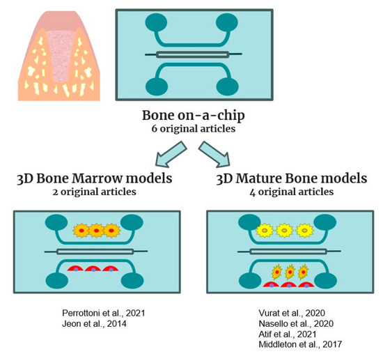 Oral bone regeneration represents a topic of increasing interest due to the growing use of dental implants to replace missing teeth. In this respect, potential regulators of bone cell differentiation have been found using a wide range of in vitro screening techniques. These in vitro methods enable us to test possible medications at the cellular level, thereby reducing animal experimentation. However, 2D culture models display various limits in recreating the intricate bone environment, and, among cells that make up bone, osteocytes present unique challenges. In addition to anatomic structure, the highly mineralized nature of bone tissue makes plastic or other planar surfaces an inadequate environmental substitute. In our review, a total of six original articles were selected for bone-on-a-chip and are listed in Figure 4 and Table 3.