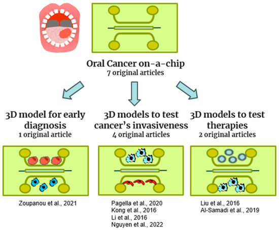 In our review, a total of seven original articles were selected for oral cancer-on-a-chip, and they are listed in Figure 5 and Table 4.