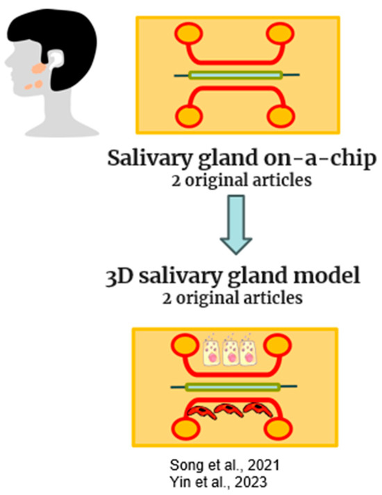 The greatest difficulty in the 2D culture of salivary gland cells is the rapid loss of secretory function observed in these cells. Saliva is necessary for good oral mucosa and dental health, and a reduction in saliva production, known as xerostomia, has severe effects on enzymatic digestion, dentition, bacteriostatic functions, and fundamental tasks, including eating and speaking. The salivary glands display a highly branched and secretory architecture, in which differentiated cell types create epithelial ducts and acini. The first 3D culture model for recapitulating salivary gland structure included scaffold-based hydrogels that allow salivary gland cells to generate spheroids capable of differentiating into acinar-like architecture [66,67]. More recently, a higher expression of salivary acinar, ductal, and tight junction markers was obtained in salivary gland cells seeded in a microwell culture than in those grown in 2D and matrigel-3D cultures [68,69]. However, these 3D culture approaches fail to obtain spatial control, particularly when addressing the branching architecture of native salivary glands and the extremely thin epithelial layers of the ducts and acini. Microfluidics technologies, on the other hand, provide superior management of both the spatial and temporal distribution of biomaterials, by obtaining a controlled shear stress. In our review, two original articles were selected for salivary gland-on-a-chip, and they are listed in Figure 6 and Table 5.