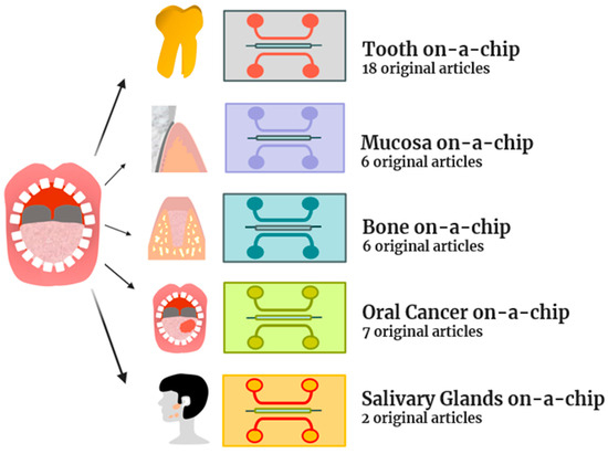 Since then, several research groups exploited this technology to investigate and reproduce salivary glands, oral mucosa, and cancer [18,19,20]. In current oral research, one-chamber, multiarray, and parallel-chamber designs were the chip designs usually adopted. The one-chamber chip represents the most common model, consisting of a single culture chamber connected to channels for fluid transport [21]. A multiarray chip is composed of multiple chambers of the same size that are connected by channels and arranged in a matrix. The chambers have the same purpose as the wells for cell culture, and multiarray chips are mostly utilized for high-throughput screening because of the possibility of establishing various conditions in each chamber [22]. In order to explore pathophysiological processes, the parallel-chamber chip is primarily utilized as a scaffold to replicate the natural tissue architecture. This design connects two or more parallel chambers either vertically or horizontally by use of a variety of structures, such as pores, membranes, or tubes [23]. A more complex chip is represented by a serial-chamber design that allows researchers to create a connection between various organ or tissue models through interconnected networks. It is suitable for emulating physiological processes in vitro, like an immune system or a digestive tract [24]. One of the most applied approaches to produce OoCs is lithography, which permits the development of structured surfaces at micrometer and nanometer scales. Microfluidic chip-based models, fabricated via soft lithography and molding, are manufactured with polydimethylsiloxane (PDMS) platforms and present channels and reservoirs that allow fluids to be controlled and manipulated at the microscale level to control experimental conditions (e.g., flow, the concentration of chemical species, rate of chemical reactions) and reduce laboratory costs by decreasing the number of reagents needed for each experiment [25]. Beyond the advantages of OoCs in overcoming the difficulties correlated with ethics and limited throughput, OoCs also permit the minimization of costs with respect to animal experimentation. This technology could be greatly beneficial in dentistry for testing novel antibacterial substances and biomaterials, for performing studies on inflammatory diseases, or for planning preclinical studies. A significant number of publications and reviews have been published on this topic. However, to our knowledge, they mainly focus on the materials used for fabrication and the different patterns of the chip applied to the experimentation. This review presents the most recent applications of organ-on-a-chip models already used in dentistry, starting from the reconstituted dental tissues to their clinical applications.