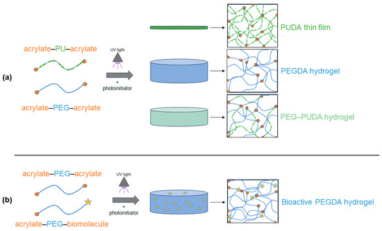 (a) Schematic representation of PUDA film, PEGDA hydrogel, and PEG–PUDA hydrogel synthesis under UV light in the presence of the photoinitiator 2,2-dimethoxy-2-phenylacetophenone (DMAP). (b) Scheme for the incorporation of bioactive molecules as pendant groups that are crosslinked into hydrogels via conjugation to acrylate-PEG-succinimidyl valerate (acryl-PEG-SVA). Blue and green lines indicate polymer chains, orange dots represent acrylate end groups, and stars represent biomolecules (peptides or proteins).