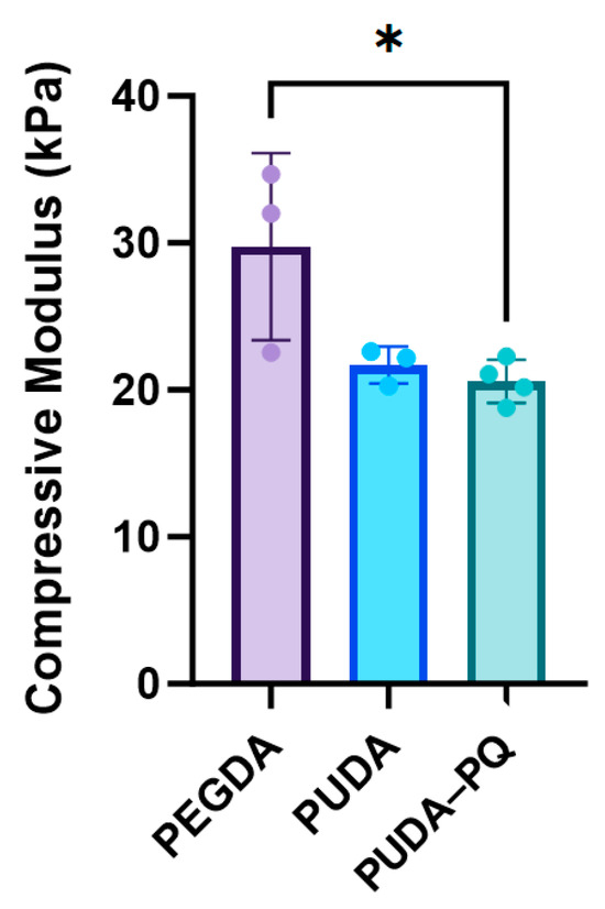Compressive modulus of hydrogels formed by UV-initiated crosslinking. The modulus was calculated as the slope of the linear region following the toe region of the stress–strain curve. Values reported are the mean ± the standard deviation (n = 3); * p < 0.05, indicating a statistically significant difference.